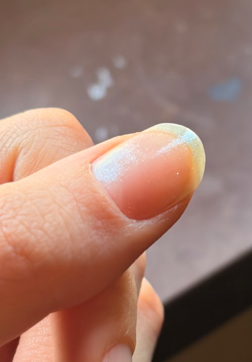 Det er et let lag af fint iriserende glitter. Jeg glæder mig til at bruge det ovenpå Essie gel couture i sheer fantasy, men selv på mine bare negle ser det smukt ud. Det er endnu flottere i virkeligheden!