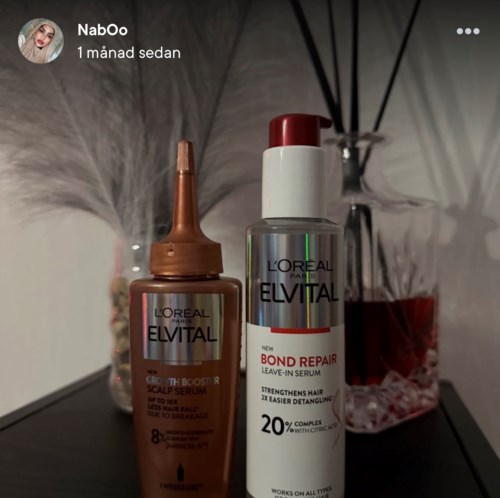 Jeg har brugt L’Oréal Elvital Growth Booster Scalp Serum og Bond Repair Leave-in Serum i cirka en måned nu, og jeg er faktisk rigtig tilfreds. Jeg kan godt lide stærke dufte, for mig var denne duft kun positiv – frisk men stadig lidt luksuriøs og “salongfølelse”. Den sidder passende længe uden at blive for meget. Serummet føles let i hovedbunden og klistrer ikke. Jeg har bemærket, at håret føles stærkere ved rødderne, og at jeg taber mindre hår ved børstning. Det føles også som om hovedbunden har det bedre og ikke bliver så tør. Sammenfattende synes jeg, at de gav gode resultater, fin duft og er nemme at bruge i hverdagen. Jeg vil helt sikkert fortsætte med at bruge dem og kan anbefale dem, især til jer der har skadet hår og kan lide produkter, der dufter lidt mere. ✨2 produkter i posten Dufter luksuriøst og gør håret stærkere – klart godkendt107 visninger - Posten blev oprettet 1 måned