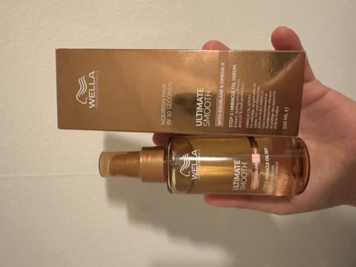 Jeg elsker virkelig Wella Professionals Ultimate Smooth Miracle Oil Serum. Det gør mit hår blødt, skinnende og meget mindre kruset uden at føles tungt eller fedtet. Nogle dråber rækker langt, og håret føles straks mere medgørligt og let at style. Jeg bruger det både i fugtigt og tørt hår, og det giver altid et friskt og velplejet resultat. Desuden dufter det virkelig godt uden at blive for stærkt. Et rigtig løft til mit hår!1 produkter i posten Velvære resultat92 visninger - Posten blev oprettet for 3 dageBedømmelse: 4 ud af 5