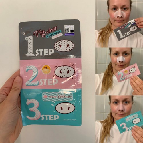 Efter rens af ansigtet påfører du trin 1 på næsen. Lad det sidde i 15-20 minutter. Gør næsen våd med lidt vand og påfør derefter trin 2 på næsen. Efter 10-15 minutter fjerner du trin 2. Derefter placerer du trin 3 på næsen. Fjern trin 3 efter 10-15 minutter og tryk let ned på området for at forbedre effekten.