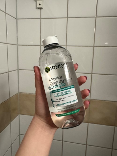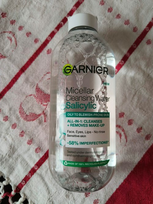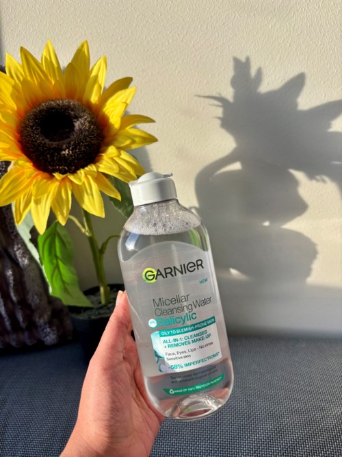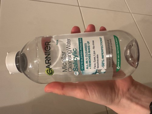 Garnier Micellar Cleansing Water Salicylic is an all-in-1 cleansing product, specially developed for you with oily and blemish-prone skin, even sensitive skin. The cleansing water effectively cleanses your skin and removes dirt, make-up, and pollution, while reducing imperfections* and mattifying your skin. Leaves no visible product residue on the skin**.