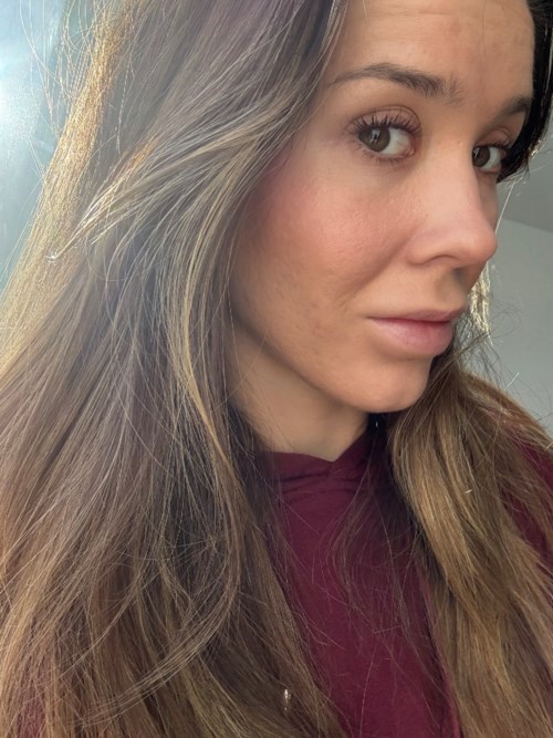 The more coral-colored/peachy of Gleeze's blush sticks is being tested on freshly cleaned skin and cold with window light #gleeze1 product in the look Peachy blush - The user's roll: Lyko Creator. The post was made 3 days