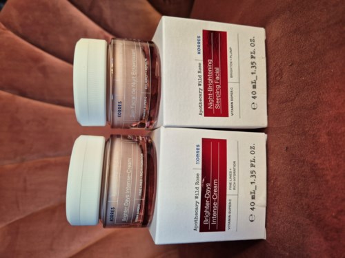 Apothecary wild rose Brighter intense day cream that is rich without being greasy, providing moisture and soothing. I notice a difference in my skin, which glows, has a more even texture, and redness is gone, and the moisture lasts all day. Gar scent in it. Apothecary wild rose night Brightening sleeping facial. A rich night cream that feels light on the skin and provides moisture throughout the night. The skin looks plump in the morning and has a nice glow with an even texture. This one also has a scent.1 product in post Korres106 views - The user's roll: Lyko Creator. The post was made 16 hoursRating: 5 out of 5