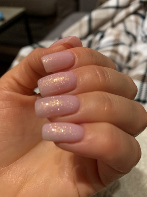 Here I have applied UV gel polish in Morning Rose over a pink builder gel (Barbie Pink from SPN). Nice consistency of the polish, cures as described, lots of small glitter particles, in the picture I only have one stroke so the pink shines through. The brush is just the right width, all in all a good UV polish. I wish there were better pictures, pictures of the product on the nail so that one can see more easily what they are ordering. Ordering a bit blindly with so few pictures of the actual product. Pictures with and without flash so others can see what they are ordering 😅