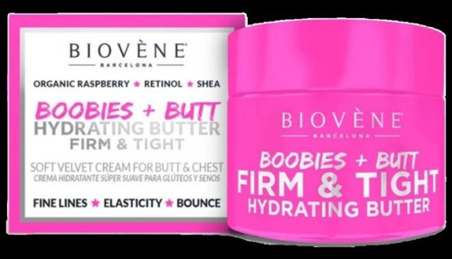 Mega-hydrating body butter for bum and breast with antioxidant-rich Organic Raspberry, Retinol and Shea to help improve skin’s texture, regain elasticity and minimize the appearance of fine lines and wrinkles with firmer and tighter skin. Retinol can help promote skin renewal, radiance, texture and reduce the appearances of wrinkles and general skin aging.