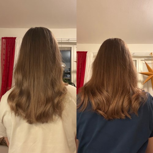 Ennen: vasemmalla ja jälkeen: oikealla. Olin odottanut syvempää tummempaa ruskeaa väristä Chocolate. Erityisesti kun pidin väriä 25 minuuttia. Tulos ei ole väärä, vain ei niin voimakas kuin olin kuvitellut. Uskon, että se toimii hieman eri tavalla eri hiuksilla. Kuitenkin hiukset tuntuvat kiiltäviltä ja hieman raikkaammilta. Joten tuote tekee sen, mitä lupaa - eräänlainen reboost. Kuitenkin sanoisin, että tämä tuote on parempi jo olemassa olevan hiusvärin virkistämiseen kuin suurten muutosten tekemiseen.