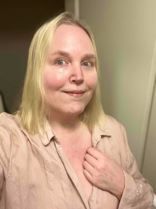 Mijn onopgemaakte gezicht met rosacea kan in een seconde als een stoplicht worden. Ik gebruik de producten van Neostrata, reiniging, serum, crèmes, op advies van een dermatoloog. Eerder had Exuviance zowel foundation als poeder, wat de dermatoloog aanbeval. Sinds dat verdwenen is, gebruik ik make-up van Colourscience, foundation, concealer, blushstick. Nu ben ik overgestapt op een kleurcorrigerende primer van Pür, evenals poederfoundation van Jane Iredale. Ik verdraag bepaalde producten van bareMinerals. Van Lyko heb ik onlangs een bronzer en een highlighter stick van Jane Iredale ontvangen, wat mijn nieuwe favoriete merk is voor mijn probleemhuid. Ik maak me niet zo ingewikkeld op. De basis moet