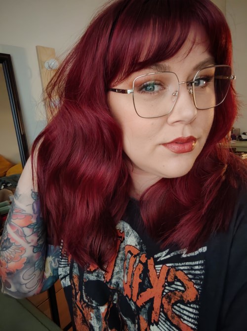 Hier komt een volledig perfecte kersenrode haarkleur MAAR als groot nadeel verspreidt de kleur zich overal in de regen en bij het zweten. Mijn brillen, paardenstaart en kleur raakten verstrikt in het zweet, en de kleur liep over mijn gezicht. Jammer, want de tint is echt prachtig.1 product in post Mooie kleur maar een vreselijke rommel!