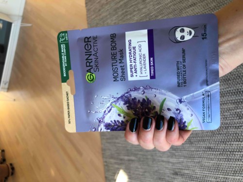 Ontdek de hydraterende kracht van het Garnier Moisture Bomb Lavender Tissue Mask. Dit masker is doordrenkt met een serumhoeveelheid die overeenkomt met één fles*, verrijkt met lavendelextract en hyaluronzuur voor een intens hydraterende en verzachtende werking.