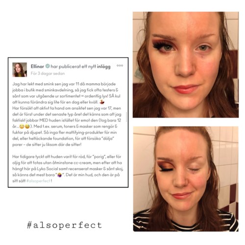 - Brukerens rolle: Medarbeider pĂ„ Lyko.Innlegget ble opprettet 4 Ă„rđALSO ME - ALSO PERFECTđ Da jeg var yngre var min stĂžrste frykt Ă„ bli sett uten sminke. Jeg var rundt 16 Ă„r og gikk pĂ„ videregĂ„ende, og husker at jeg ville heller komme forsent pĂ„ skolen, enn Ă„ mĂžte opp uten Ă„ ha fikset meg. Full pakke med masse sminke og hairextensions - hver bidige dag, kun fordi jeg var usikker. Spol ti Ă„r frem i tid, og her sitter jeg - 26 Ă„r og mest glad i meg selv sminkelĂžs, eller med lett makeup som fremhever mine beste trekkđ» Man er virkelig perfekt akkurat som man er, og jeg tror det er viktig Ă„ huske pĂ„ det i situasjoner man kan fĂžle seg usikkerđ Det viktigste er hva som gjĂžr deg til DEG - enten det er med full makeup eller helt sminkefri!⚠«Be yourself. Donât worry about what other people are thinking of you.» - Phil Lester. #alsoperfect