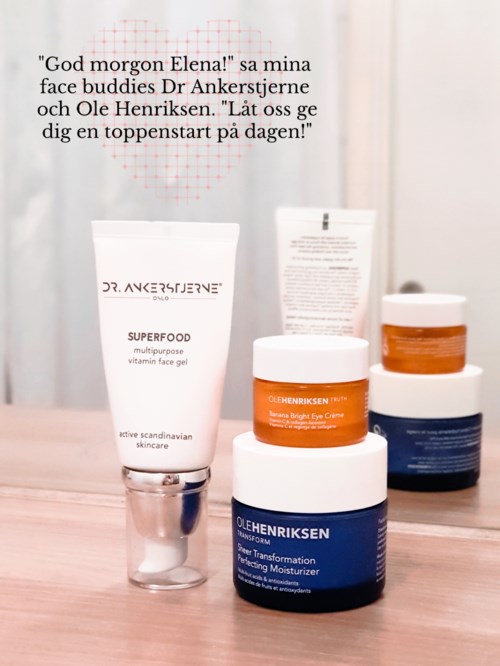 *gäsp* och godmorgon! Här kommer en ganska så typisk morgon-hudrutin à la Elena, för den som tycker sådant är roligt :) Denna rutin är betydligt enklare än kvällsrutinerna, då jag gillar att hålla det simpelt men ändå få med det viktigaste! Efter en god natts sömn på min #SoftCloud mulberry silk örngott (oh my goooood så mjukt och skönt örngott!!! Review på denna kommer framöver!) så börjar jag morgonen med att tvätta ansiktet med behagligt varmt vatten. På ett torrt ansikte applicerar jag sedan det fantastiska Superfood-serumet från #DrAnkerstjerne följt av ögonkräm och dagkräm från #Ole Henriksen.... och svårare än så är det faktiskt inte! Jag väntar en stund innan jag börjar sminka mig så att produkterna hinner absorberas ordentligt. Jag tycker att dessa godingar utgör en utomordentlig fullgod bas till makeupen och huden känns återfuktad och behaglig ända fram till kvällen! Önskar er alla en fin torsdag! <3