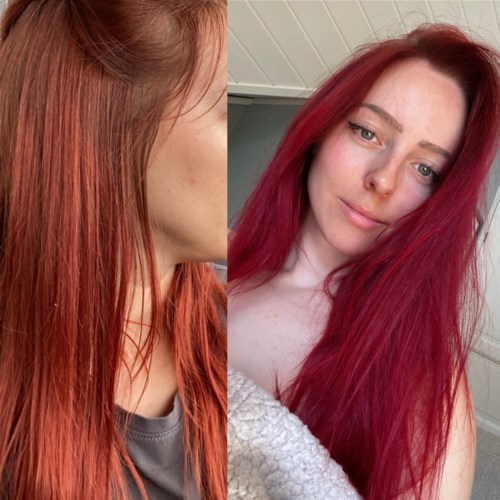 Jeg blandet vampire red og en mørk lilla i håp om å få den mørkere. Å ta i fargen var stress fordi det stainer alt (stainer forsåvidt alt etterpå også når håret er vått). Jeg hadde det i i 30 min og er ganske fornøyd! Ble veldig glansfullt og kanskje en smule for intenst, men det går bra. Føler faktisk at fargen har sittet lenger enn mini coloren jeg får hos frisøren. Er 3.5 uke siden jeg farget det og begynner å bli litt redd for at det ikke skal fade mer.1 produkt i posten Veldig intens men fornøyd4434 visninger - Innlegget ble opprettet 3 år
