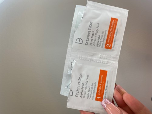 Denne daglige eksfolieringen fra Dr Dennis Gross er fantastisk. Jeg har tørr hud som fort kan bli litt ujevn og få tørre flekker dersom jeg ikke gir den konstant fukt og eksfolierer regelmessig. Produktet består av to servietter som brukes med et to minutters mellomrom på morgen eller kveld. Den første servietten gir fra seg litt duft av kjemikalier som nærmest svir i øynene, så jeg ville anbefalt å stå med åpen dør slik at duften får spredt seg ut i rommet. Duften på den første servietten er slett ikke ubehagelig, bare litt sterk. Den andre servietten lukter litt verre, men jeg setter pris på at disse ikke er overparfymerte. Disse serviettene fra Dr Gross gir en skånsom og forsiktig daglig eksfoliering som varer hele dagen. Etter å ha brukt disse hver morgen i flere uker føles huden min mye jevnere og har en fin glød. Jeg merker at jeg bruker mindre fuktighetskrem på morgenen og at jeg ikke har hatt noen tørre flekker etter bruk. Jeg ville anbefalt dette produktet til den som ønsker jevnere hud med fin glød, og som har råd til å bruke litt ekstra på sin hudpleierutine. #drdennisgross #lykoinflutester