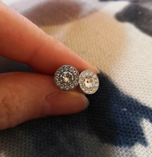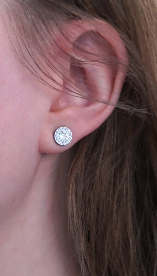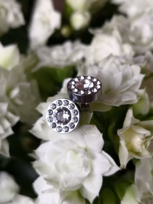 Øredobber utviklet i samråd med hudlege, i ren medisinsk titan med krystaller. Sølvfarget belegg som ikke kommer i kontakt med huden.