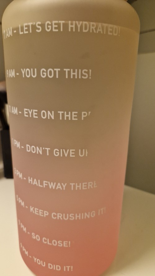 Ekstra stor motivasjons-vannflaske som rommer hele 2,2 liter med vann. Flasken har både tidsmarkør, hank og sugerør. Denne lekre flasken hjelper deg med å drikke nok vann gjennom dagen, på trening og når du ellers er aktiv. Flasken er lekkasjesikker og laget i BPA-fri PETG. PETG er fullt ut resirkulerbar og materialet har den styrke, holdbarhet, fleksibilitet, høy slagfasthet og varmebestandighet som gjør det til det perfekte materiale for mat- og drikkebeholdere. Flasken tåler opp til 60 grader, men kan ikke vaskes i oppvaskmaskinen. Bred åpning, enkel å fylle og rengjøre. Tips! Fyll flasken med masse isbiter og litt oppskåret frukt, det gjør vannet ekstra fresht og godt!