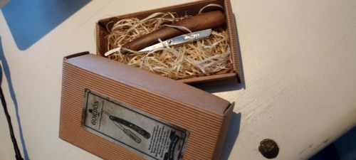 Barberkniv i metall og trehåndtak. Passer til alle dobbelblad på markedet. Klassisk konstruksjon og enkel å skifte og vedlikeholde.
