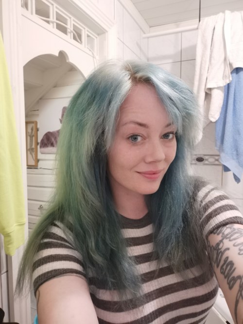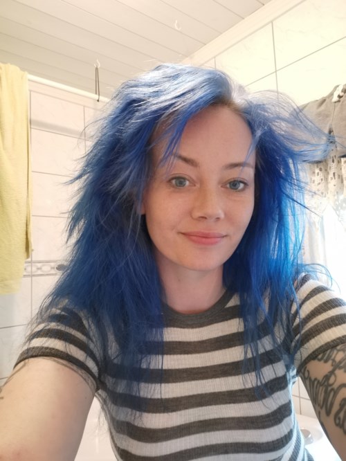 Det krever mye å gå fra knall blå til blond, og jeg valgte frequent use siden jeg trodde jeg måtte bruke den mange ganger for å få bort det blå, spesielt fordi det også står i bruksanvisningen at dette produktet ikke vil fungere på sterke farger som blå og grønn. Men endte opp med en lys blå/grønn farge allerede første gang, så jeg går rett på bleiking etter dette. Ingen plager i hodebunn, og etterbehandlinga gjør håret silkemykt. Det er viktig å følge alle tider som er satt for skylling etter sittetiden, så du får bort all avfarging fra håret. Den lukter nemlig ikke spesielt godt, men skyller du godt nok, forsvinner lukta også. Så jeg syns alt i alt at produktet var bra! Velger garantert denne igjen om jeg skal avfarge. - Innlegget ble opprettet 9 måneder