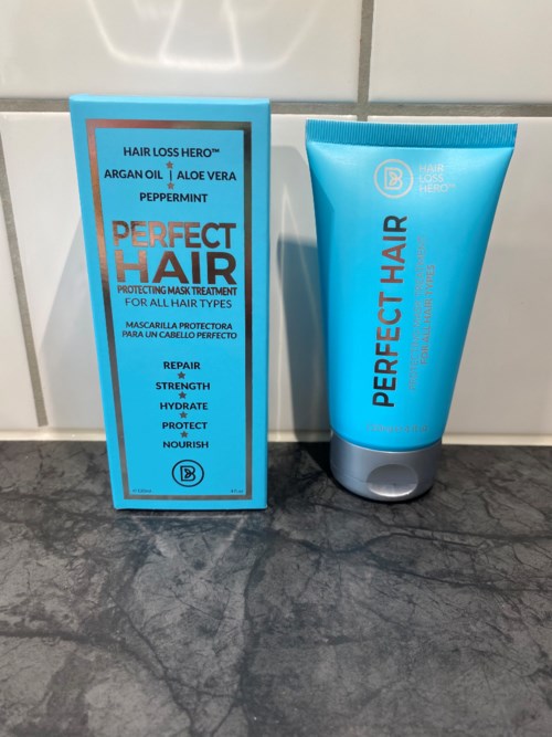 Hair Loss Hero™ PERFECT HAIR er en beskyttende hårmaske for hjemmebruk som inneholder arganolje og stjerneingrediensene peppermynte og aloe vera som fukter, styrker og gir nytt liv til skadet hår.
