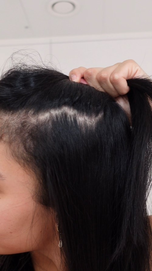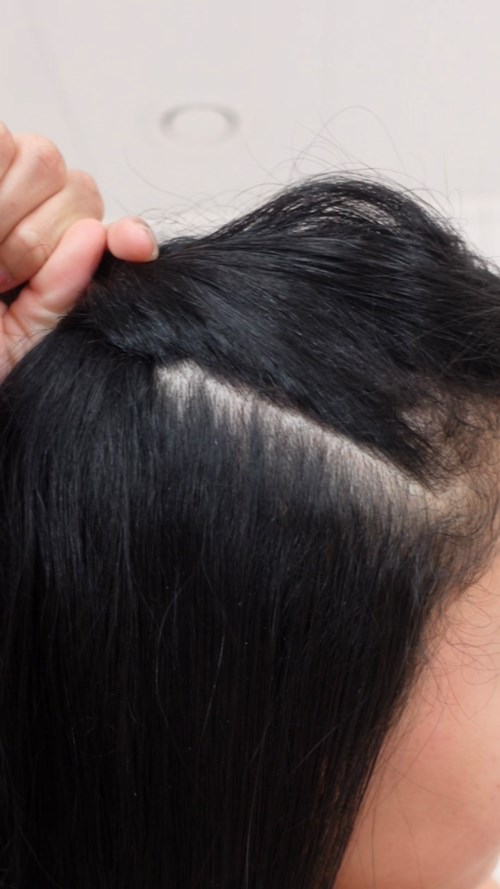 Trinn 1: Ha 1 skje med Micro-Peeling i en bolle og påfør den med en børste på tørt hår direkte på hodebunnen. Lag seksjoner og spre MICRO-PEELING i hele hodebunnen.