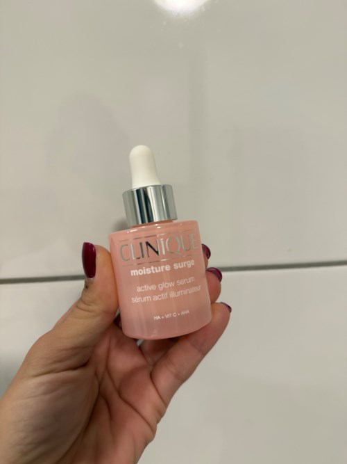 Moisture Surge Active Glow Serum fra Clinique er et lett eksfolierende serum med 5 % melkesyre, hyaluronsyre og vitamin C som hjelper til med å eksfoliere, fukte og lysne huden. Serumet eksfolierer skånsomt og fjerner døde hudceller samtidig som det gir fuktighet i dybden og lysner hudtonen for et mer strålende utseende.