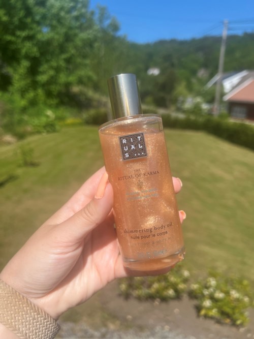 Jeg bruker vanligvis ikke shimmer oljer, men synes det er kan være super fint på sommeren når man har fått litt gyllen farge i huden.☀️😍 ☀️ Den er rask og lett å påføre. ☀️ Trekker fort inn i huden og føles ut som en dry oil, noe som faller godt i smak hos meg. ☀️ Fantastisk sommerlig forpakkning som jeg ELSKER! ☀️Solid og vakker flaske, som ser ufattelig fin ut på badroms hylla. Oh, å for alle glitter og shimmer elskere der ute slik som meg, så er dette DRØMMEPRODUKTET! 😍 For snakk om shimmer 😍 Kan sitte å stirre på denne flasken i evigheter 😍 Desverre kommer det også et minus med denne for meg 🫢 🌦️ Skulle ønske det var en annen «flaske tut»/kork for denne resulterte i at flasken hadde lekket utover hele pakken min, og nå gir shimmer olje til alt den kommer i kontakt med. #LYKOINFLUTESTER #RITUALS #KARMA