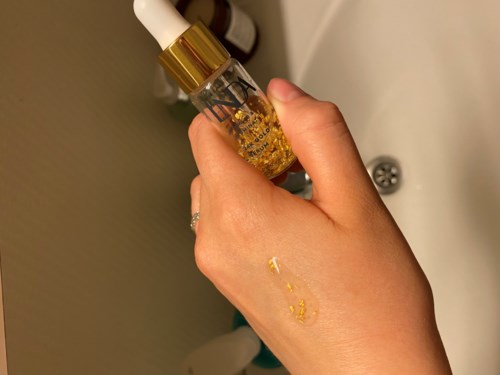 • Smør et generøst pump av 24K Gold Serum på ansikt og hals