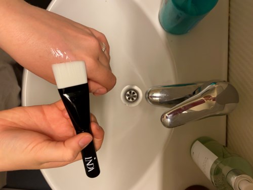 • Fukt hendene igjen og masser ansiktet i 15-20 sekunder