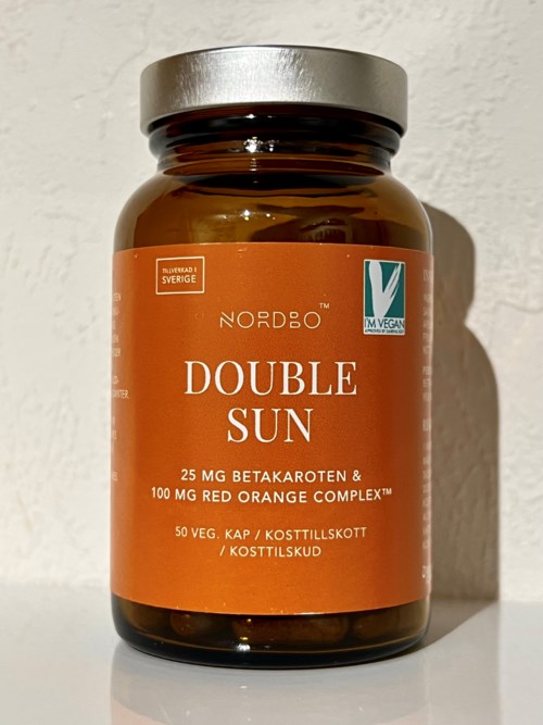 NORDBO Double Sun er utviklet for solbrun hud, økt glød og varig solbrunfarge. Med blodappelsinekstraktet Red Orange Complex™ i kombinasjon med naturlig betakaroten. Red Orange Complex™ inneholder ekstrakt fra tre sicilianske blodappelsiner: Moro, Tarocco og Sanguinello. Blodappelsinene blir uvanlig rike på pigment og næringsstoffer takket være de store temperaturforskjellene mellom dag og natt på Sicilia. Red Orange Complex™ har dokumentert effekt på hudtonen og redusert rødhet i huden. Betakaroten er en fargerik antioksidant som gir bær, frukt og grønnsaker deres gule og oransje farge. Betakaroten er et naturlig forstadium til A-vitamin. Kun det kroppen trenger omdannes til A-vitamin, mens resten lagres i underhudsfettet, der det bidrar til hudens pigment og glød. Betakarotenet utvinnes fra mikrosoppen Blakeslea trispora og har høy biotilgjengelighet. Double Sun er perfekt å bruke før sommeren eller før en ferie. Begynn gjerne minst en måned før. Husk at Double Sun ikke erstatter solbeskyttelse. Kun 1 kapsel per dag. Double Sun er vegansk sertifisert av Djurens Rätt. Burken er laget av glass, og lokket er av metall. Glass og metall kan resirkuleres uendelig og gir et fullstendig beskyttelse mot fukt og luft. Produktet er utviklet og produsert i Sverige av NORDBO - et familieeid merke fra Malmö, som utvikler kosttilskudd basert på innovasjon, dokumentasjon og bærekraft.