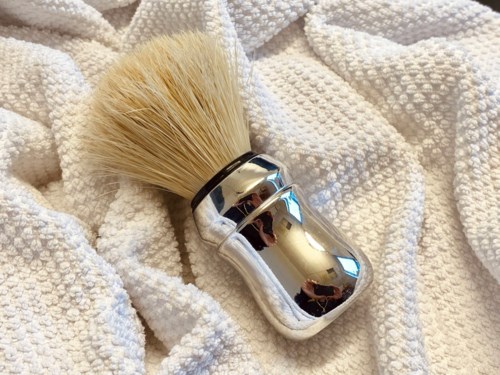 Proraso barberkost med naturbust. Denne kosten er stivere enn grevlinghår og gir mer friksjon, nesten som en peeling, men har ikke samme oppsugingsevne som en bust av grevling.