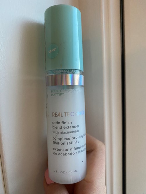 Spray Satin Finish Blend Extender på svampen og press på huden etter at du har brukt foundation for sminkemagi. Satin Finish setter seg, frisker opp og blendes mens du sikrer basen din.
