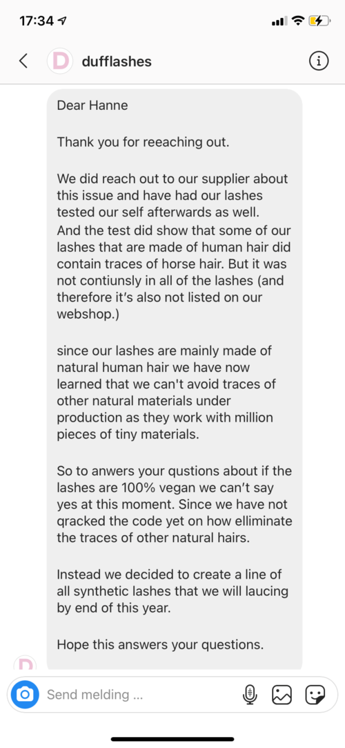 Dårlig markedsføring av disse vippene. Sier at de er "faux" mink på boksen men viser seg at det er laget av ekte dyrehår. Uetisk og umoralsk. Skal aldri kjøpe vipper fra slike folk.1 produkt i posten Ikke vegansk og dyrevennlig1957 visninger- Kommentaren lades 5 årVippene fra DUFFLASHES har tidligere blitt markedsført som "veganske og dyrevennlige". Etter tester som har blitt gjort, har det vist seg at vippene til dufflashes inneholder dyrehår (mink og hestehår). Jeg har også kontaktet duff direkte og spurt hvorfor de har "silke og menneskehår" oppført på nettsiden når vippene deres inneholder dyrehår og fikk "We cant avoid traces of other natural materials under production". Så det at vippene KUN er laget av silke og menneskehår blir feil å si. I det minste kan det bli oppført at vippene har spor av dyrehår så folk som bryr seg om det slipper å kjøpe noe de ikke støtter. Jeg legger til screenshot av svaret jeg fikk fra de.2 liker