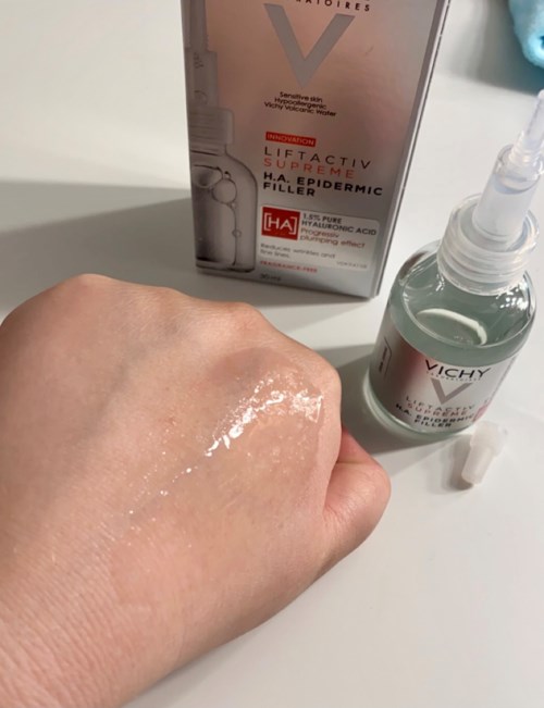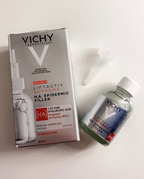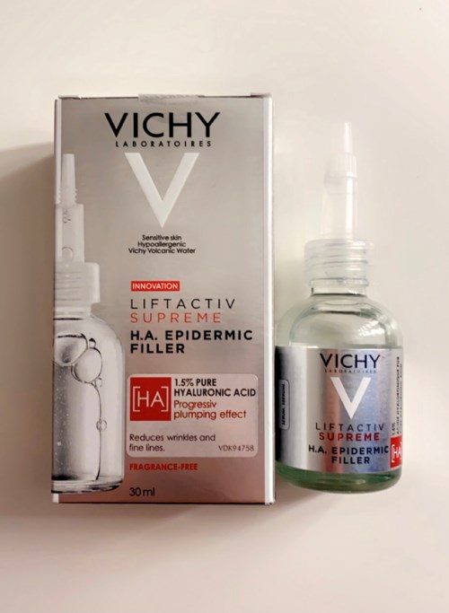 Vichy Liftactiv Supreme H.A. Epidermic Filler er et intensivt anti-age serum for ansiktet og sensitiv hud rundt øynene. Den inneholder blant annet 1,5 % hyaluronsyre, vitamin C og vulkansk vann fra Vichy, som fyller huden med fuktighet og får den til å se fyldigere og glattere ut.
