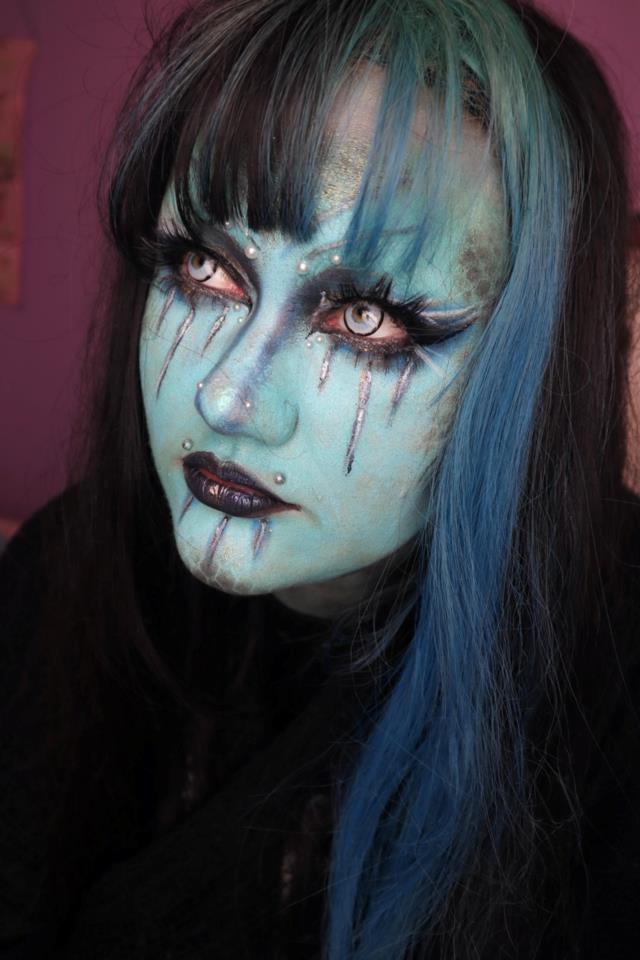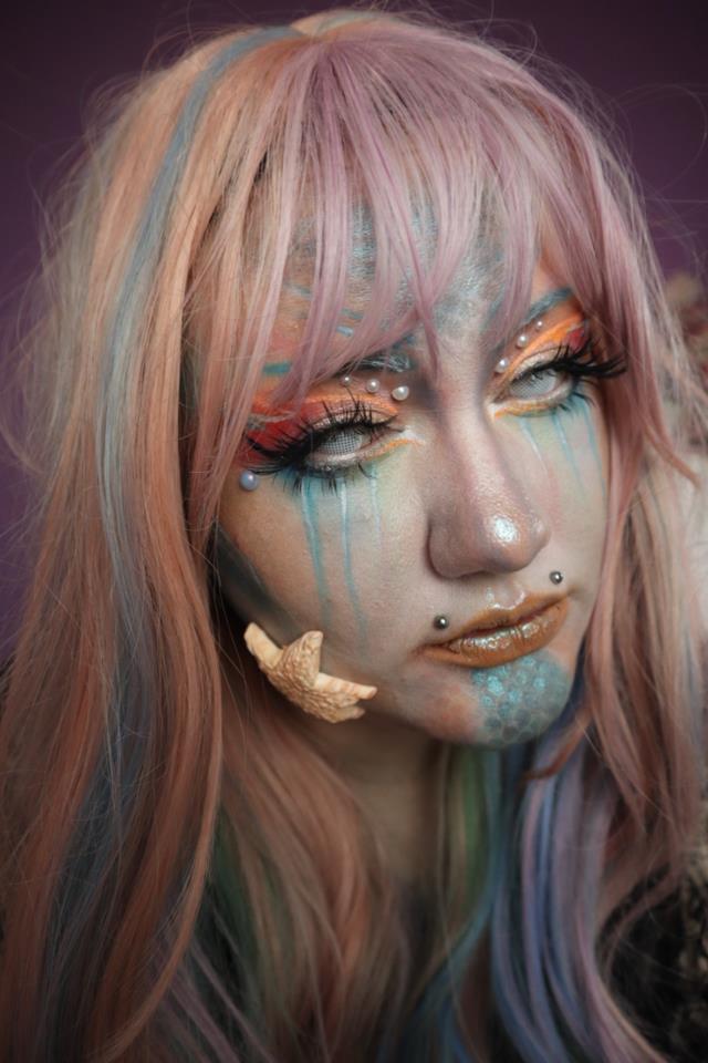 Trochę w tym samym stylu co poprzedni makijaż, zrobiłam to: Testowałam 3 pary różnych soczewek, aby uzyskać trochę różne efekty, soczewki sclera są zdecydowanie za duże dla moich oczu, więc ledwo widzę, a one się wyginają. W każdym razie chciałam zrobić coś inspirowanego syreną, a kolory w tej peruce zainspirowały mnie ~💖 #halloween25