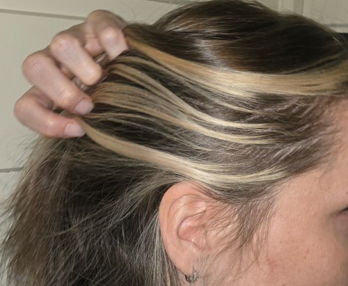 - Nałóż mieszankę na testowe włosy, upewniając się, że włos nie dotyka reszty twoich włosów.