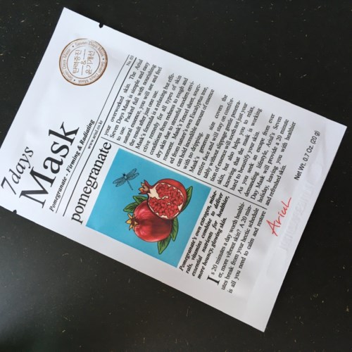 Jag blev nyfiken på denna Sheetmask Ariul Pomegranate 7Days Mask 20g pga namnet och att ingen ännu skrivit någon recension på den! Många av oss är väl medvetna om kostens betydelse både för kroppens invärtes boost och utsidan! Jag är starkt ”troende” på granatäpplens betydelse med sitt otroliga värde av antioxidanter och jag använder mig ofta av äpplesyror i hudprodukter likaväl som en boostdrink med citron och äppelcidervinäger! Nu tillbaka till denna Sheetmask som är full av mineraler, vitaminer och aminosyror som bidrar till friskare hud. Lystergivande, uppstramande, utslätande och vårdande! Paraben fri och mineralolja fri, Dermatologiskt testad och crueltyfree! Passar alla hudtyper. Masken ligger väl i essence/serum, inget rinnande eller klet direkt! Upplever den lätt att veckla ut och applicera på huden! Passformen gillar jag, jag är tacksam så länge den är mer rymlig och inte är för liten! Det går alltid att justera om det skulle upplevas bättre. Jag behöll originalet! Materialet är skönt mot huden! Mild doft, fräsch...direkt vid applicering som en kall bris föll på ansiktet...riktigt skönt och avkopplande!Upplevde ingen irritation på min hud...bara glädje och skönt! Lät den verka ca 30 min på min normal/kombinerade hud, en perfekt tid för masken att verka på djupet! När jag tagit bort masken masserar jag in resten av serumet i huden som inte har absorberats under tiden. Därefter väntar jag 20 min så serumet sugs upp av huden innan jag applicerar min ansiktskräm. Jag upplever en galet fin lyster och att huden får näring...nytt liv! Jag gjorde masken på morgonen och fick en lysterkick att fortsätta dagen! Jag kommer absolut att köpa denna fler ggr då den ger ett resultat som jag är nöjd med! Kommer även att testa de andra sheetsen i 7days serien! Helt klart 5 pomegranate! SuperSkön Sheet!!!