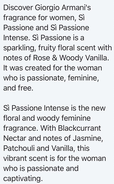 Giorgio Armani Sì Passione Intense Eau de Parfum. Sí Passione Intense är en strålande och fascinerande blomsterdoft som stärks av jasmin som är den mest förföriska blomman enligt Giorgio Armani. Sì Passione Intense är en hyllning till kontrasten mellan de fina blomsternoterna och intensiv passion.