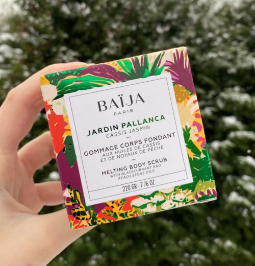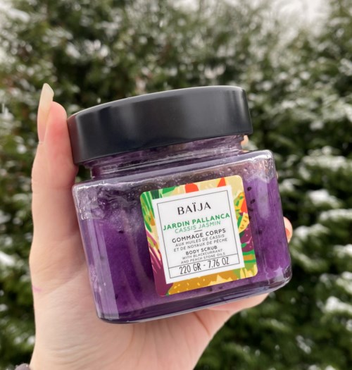 Jardin Pallancas bodyscrub med dess härliga smältande konsistens kombinerar saltkorn, svartvinbärsfrön, svartvinbärsolja och persikokärnolja för att försiktigt exfoliera huden och ta bort orenheter. Huden är förstärkt och strålande från första appliceringen. Denna beroendeframkallande behandling lämnar en gnistrande och söt doft av svarta vinbär och jasmin på huden. Dess fördel? Den unika texturen som gör den lätt att applicera. Formulan innehåller minst 96% naturliga ingredienser