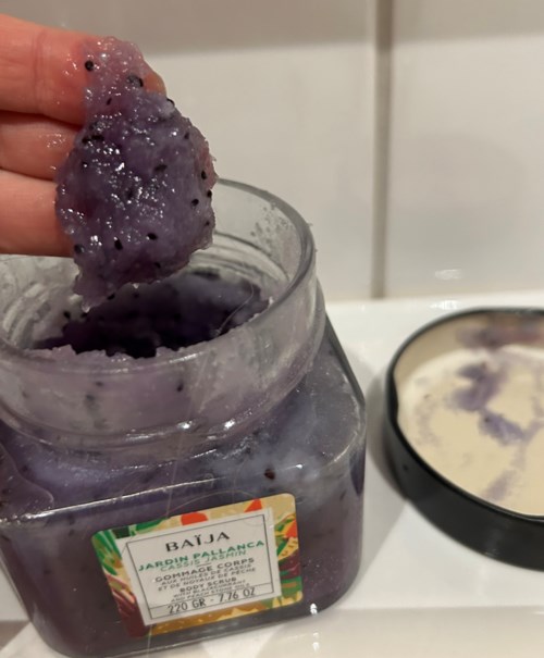 Denna kropps skrubb är så lyxig. Likt märkets andra produkter är förpackningen färgglad och man känner sig upprymd när man öppnar den. Förpackningen är tung vilket jag var oförberedd på. Dom flesta skrubbar kommer i plastförpackningar medan denna är i glas. Kanske inte helt optimalt i duschen då det är halt. Själva skrubben är lila med mindre sockerkorn och större svarta frökorn och något mer oljig än jag är van vid. Det är bra riv i den vilket jag gillar i en skrubb. Oljan gör att huden känns mjuk och återfuktad efteråt trots att den är väldigt grovkornig. Tänker att det balanserar upp att den är så rivig på ett bra sätt och gör att det fungerar på dom flesta hudtyper. Själv har jag torr hud och upplever att den återfuktar väldigt bra. Doften är magisk och tillför verkligen till produkten och ger en liten spa känsla i duschen. Prisklassen är i högsta laget för en skrubb men kan absolut tänka mig köpa om den dels pga doften men även att jag gillar rivigare skrubbar. #LYKOINFLUTESTER #BAIJA - Inlägget skapades 1 årBetyg: 5 av 5Verifierad testare