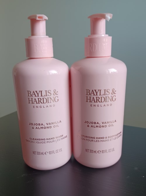 Signaturkollektionen Jojoba, Vanilla & Almond Oil är Baylis & Hardings sofistikerade serie. Doften är en söt blandning av milda toner av vanilj och mandelolja blandad med sötma från jojoba. Kollektionen har vackra nyanser av ljusrosa och lavendel med geometriska guldfolie som gör designen glamorös.