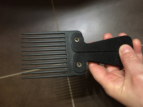 Afrocomb som har ett ihopvikbart handtag för enklare förvaring och skydd.
