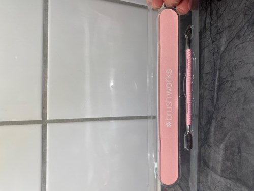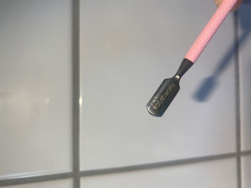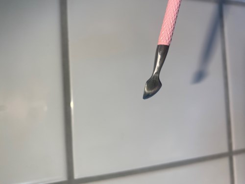 Denna dubbelsidiga nagelbandspusher petar försiktigt ned nagelbanden från nageln. Den böjda änden följer nagelbandens form, medan den platta änden är utformad för att lyfta eller trycka undan envisa nagelband på rätt sätt.