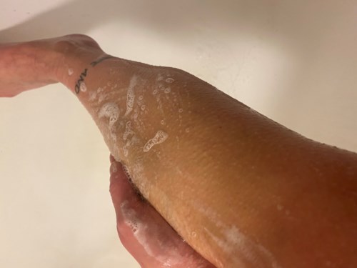 Fukta huden i duschen och applicera önskad mängd tvål i cirkulerande rörelser, eller häll i badvattnet under rinnande vatten för att skapa ett skum. Skölj av noggrant.