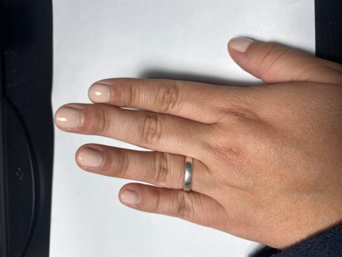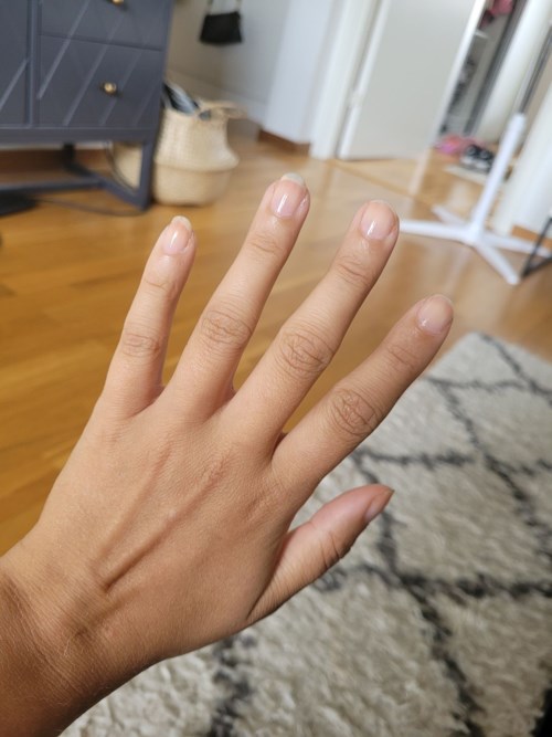 Men oj oj OJ! Jag har generellt sett väldigt mjuka och känsliga naglar och de har varit väldigt torra och trasiga efter att jag om och om igen petat och dragit bort nagellack istället för att använda nagellacksborttagning (jag vet, jättedåligt). Naglarna har liksom varit synligt torra (ljusare och nästan lite mjöliga) och sprickor har bildats ovanpå naglarna. Jag har använt kokosolja och krämer för nagelbanden, men inget har hjälpt för själva naglarna. Jag köpte tillslut det här lacket nästan i desperation, men trodde egentligen inte att det skulle funka. Hade på det lite över en vecka innan jag tog bort det och OJ vad förvånad jag blev! Torrheten är helt borta! 😱 Sprickorna är såklart kvar, men inte alls lika synliga eftersom naglarna är återfuktade igen. Det har gått ett par dagar nu och naglarna ser fortfarande fina ut 🌟 Det enda som drar ner betyget är att jag tycker att konsistensen på lacket gjorde att det var svårt att få det snyggt. Även med två lager såg det lite ojämnt ut. Men det här kommer ändå absolut bli en del av min nagelrutin! Ska bli spännande att se om det även kan hjälpa mina naglar att bli starkare i det långa loppet! Ångrar nu att jag inte tog någon före-bild, men jag bifogar en bild på hur de ser ut nu.1249 visningar - Inlägget skapades 2 årBetyg: 2 av 5Verifierad köpare