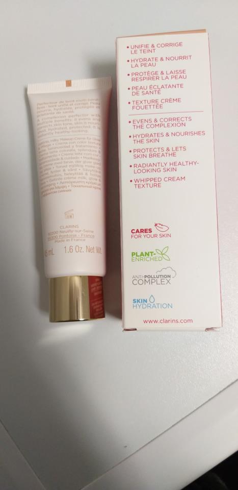Tonad mjölkig make-up creme som jämnar till hudtonen samtidigt som den vårdar, skyddar och ger lyster. Återfuktar och ger komfort. Texturen är rik men ändå lätt och luftig och går lätt in i huden. Ger en lätt till anpassningsbar täckning. Innehåller acerolafrön som är syresättande och Huang Qi är detoxande. Leaf of life ger fukt och persikomjölk ger näring. Clarins anti-pollution komplex skyddar huden mot skadliga föroreningar.