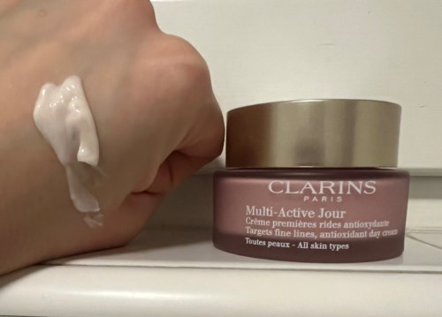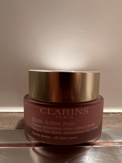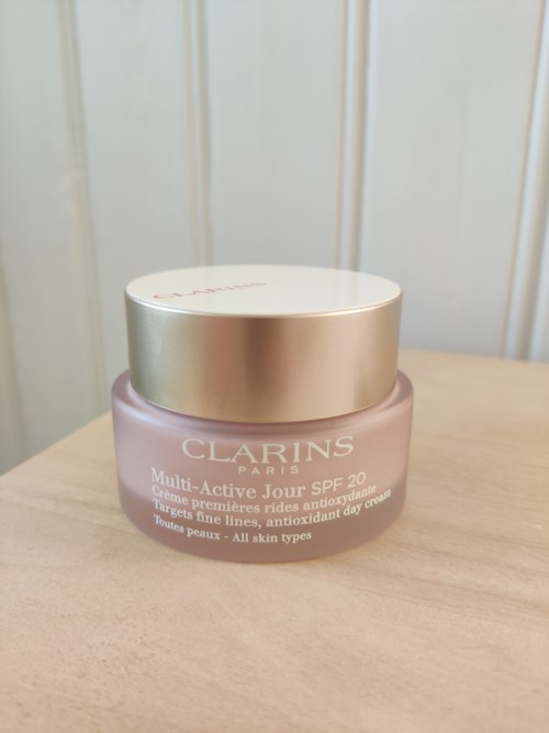Multi-Active Jour har en fräsch creme-konsistens för alla hudtyper med en fruktig / blommig doft på en bas av körsbär och vit syren. Innehåller bl a pigment och fritt organiskt tistel-extrakt (omedelbar och långvarig lyster), kapslad organiskt tistel-extrakt (antioxidant), Myrothamnus-extrakt (korrigerande) samt dubbel hyaluronsyra och Clarins anti-förorenings komplex (återfuktar och skyddar mot föroreningar).