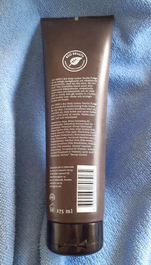 200 ml500 mlBODY LOTION VANILLA FUDGE är en ekologisk mjukgörande och väldoftande kroppslotion med det lilla extra för torr hud. Den doftar ljuvligt av vanilj och fudge. Den innehåller bland annat antioxidantrik blåbärsfröolja, avokadoolja samt shea-och kakaosmör. Den går snabbt in i huden och kladdar inte, vårdar och mjukgör huden på djupet. Denna är doftsatt med ett extrakt av vanilj. c/o Gerd tillverkar ekologiska och naturliga skönhetsprodukter i sin egen fabrik i JokkmokkProdukterna tillverkas av råvaror som har liten eller ingen belastning för natur, djur och människa och så långt de går är råvarorna ekologiska, eko-certifierade eller utvalt- processade för att värna om miljön. Produkterna är inte djurtestade och är fria från palmolja, silikoner, mineraloljor, PEG/PGG, mikroplaster, parfymer eller parabener. Tuberna är gjorda av grön PE-plast.