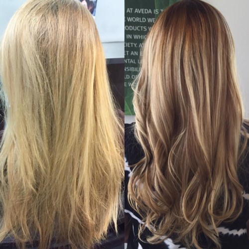 - Inlägget skapades 5 årHej Mitt hår är som bilden på väster+slingor... Jag vill bli av med de gula och mörkare utväxt... Hur kan jag nå resultat på höger? Något "söt" brun typ. Vilka produkter skulle ni rekommendera?46 visningar