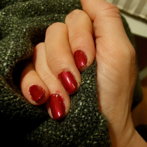 Köpte färg 52 - shine on me. Och skiner gör det! Jätteglansigt, supertäckande (på bilden är det ETT lager och ett klart över det). Torkade fort (vilket är tacksamt då jag tydligen alltid ska bli kissnödig så fort jag målat naglarna 🥴). Färgen på min bild överensstämmer inte helt med verkligheten. Det är någonstans mellan hallon- och vinrött (någon annan har delat en bild på färg 54 som överensstämmer bättre). Inte så rosa som hallon men inte så mörkt (lilatonat) som vin. En färg som funkar både sommar och vinter. Supersnyggt! (Säger hon som inte är så förtjust i röda lack annars). Nu återstår bara att se hur mycket stryk det tål innan det börjar falla av.1 produkt i inlägget Yay! It shines on me!4723 visningarAnna