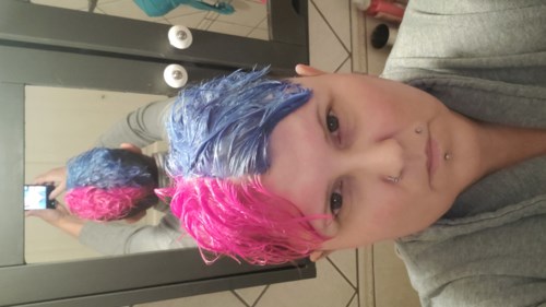 - Inlägget skapades 2 årKlippt mig känns bra . Klippte bort all färg nästan så blev en kväll i färgens tecken . *Jag blekte överhåret. * färgade sidor och där bak mörkt brunt. *delade med mittbena ena sidan rosa och ena sidan blå