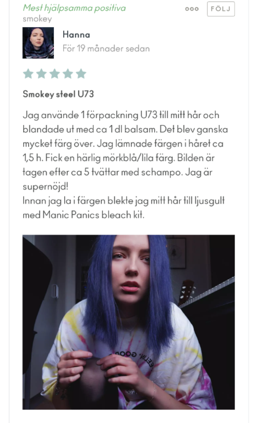 Lite svårt att få på bild men mitt krångliga hår tog inte färgen super bra! Men det blev en cool effekt så kommer nog köpa igen! Kanske ska låta det sitta i 1.5 timme som någon skrev, körde 50 min på mitt igår!1 produkt i inlägget Amethyst Chrome11872 visningar- Kommentaren lades 4 årHär är den recensionen! Är dock en annan färg men såg så många dåliga recensioner så tänkte att det hjälper att låta det sitta längre. Kör du också lila?1 gillar